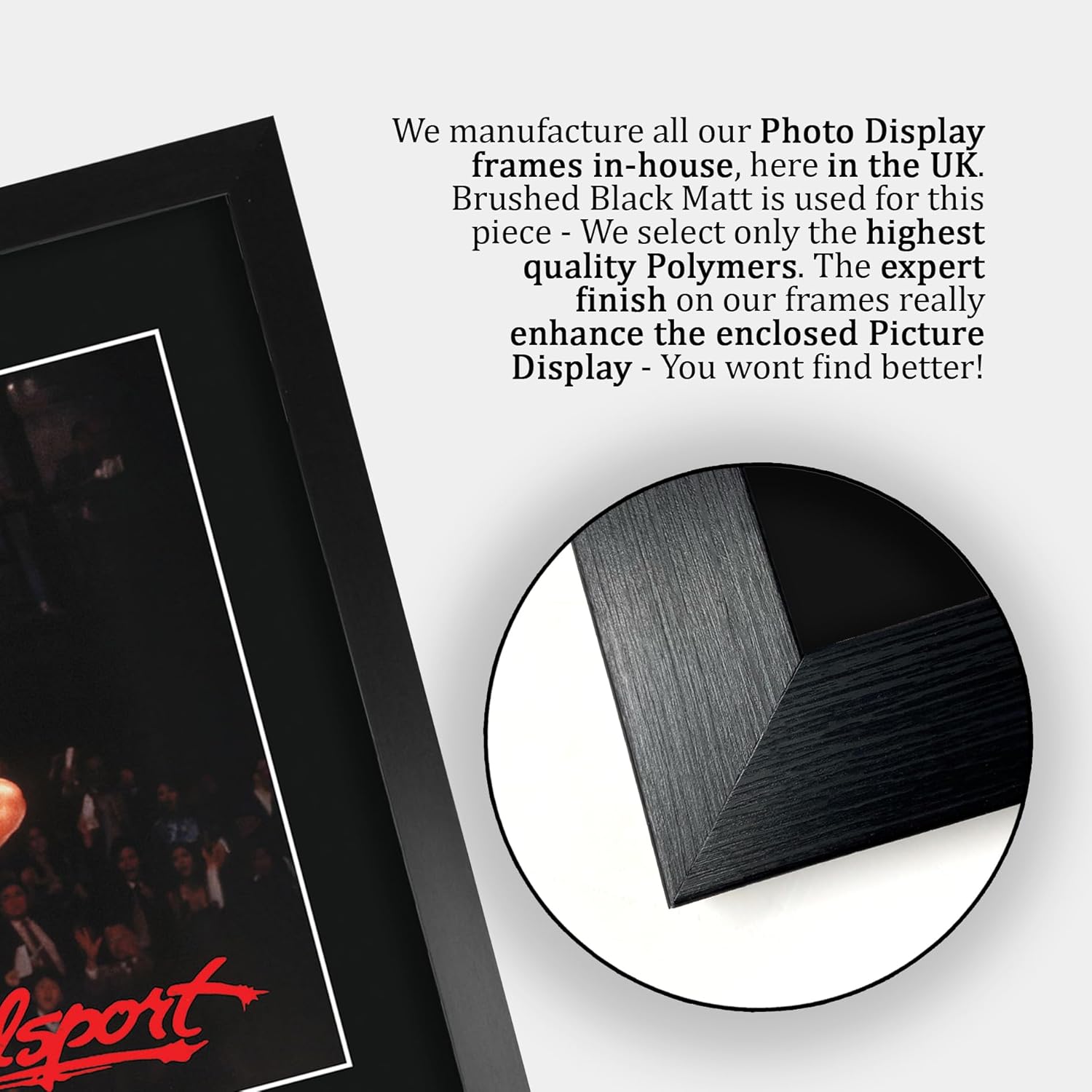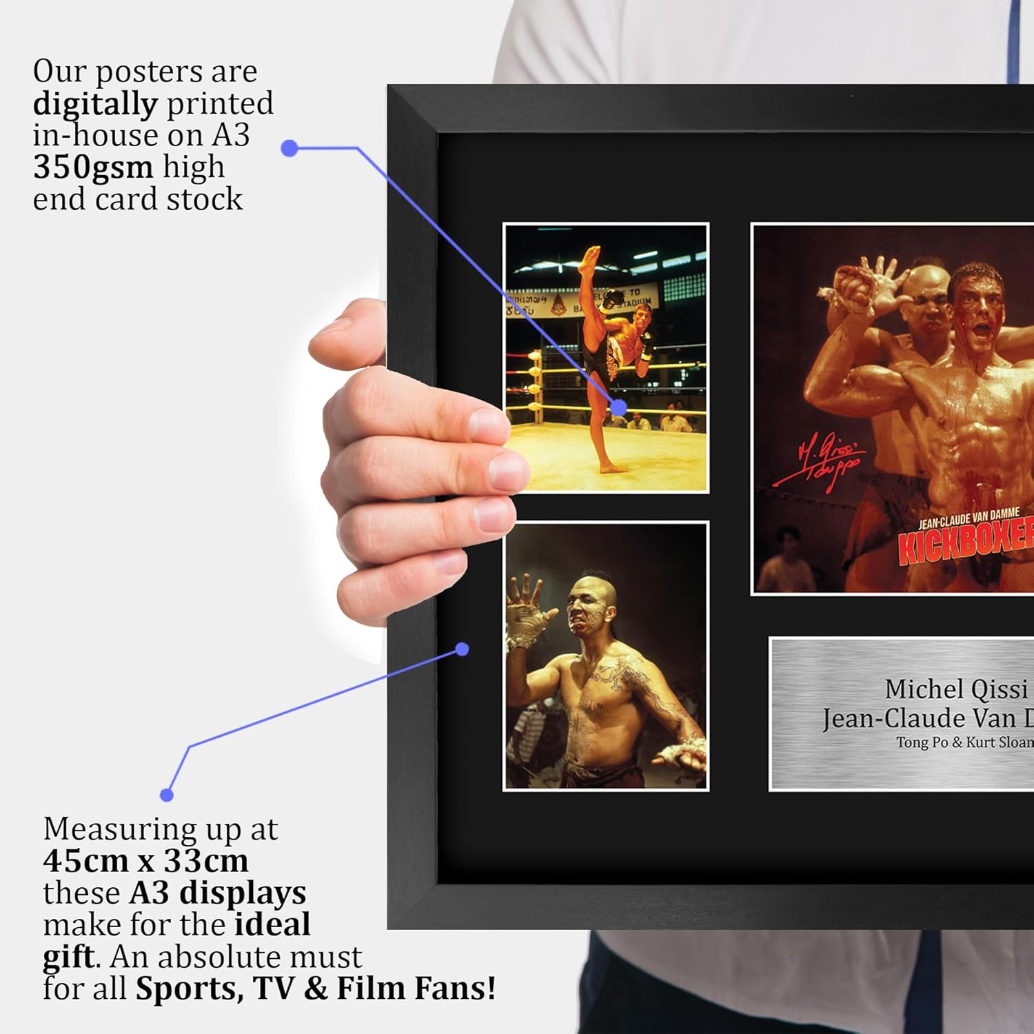 Professionally made in our studio, this framed BloodSport - The Cast display comes with a high-quality poster style picture with printed copies of the stars famous autograph signature. Framed and mounted in a matt black using an acid-free display board an framed a sleek black Polycarbonate frame which compliments the matt mount display perfectly. Lightweight, but of the highest quality, these make the ideal Christmas/Birthday gift for fans of all ages, and best of all, it definitely won't break the bank!